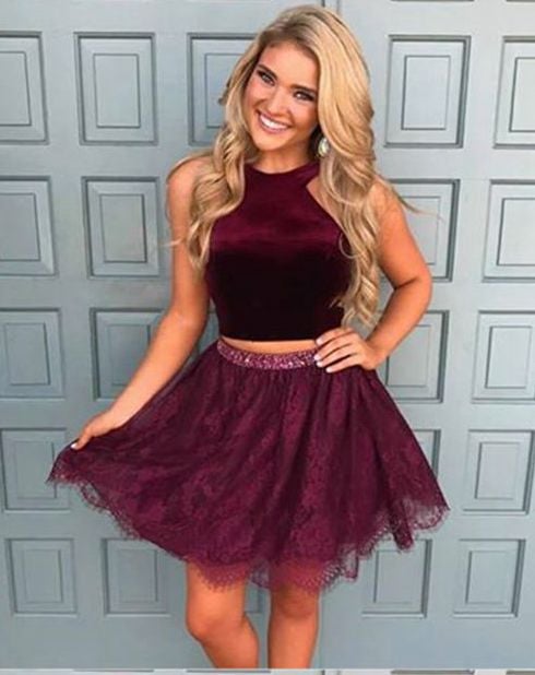 Burgundy two pieces lace short prom dress, burgundy homecoming dress