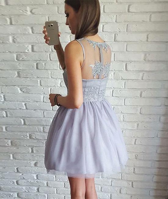 Cute gray v neck lace short short prom dress, tulle homecoming dress