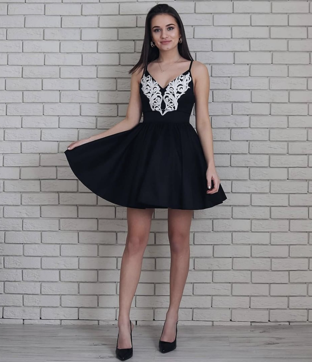 Black v neck lace short prom dress, black homecoming dress