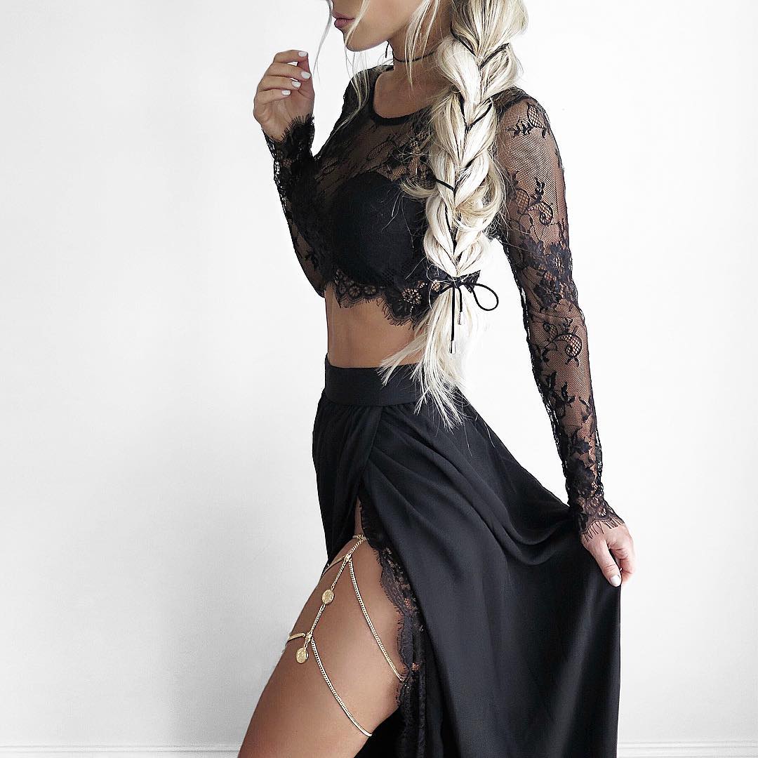 Stylish black lace long sleeve prom dresses for girl,2 pieces evening dresses