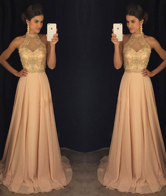 Champagne high neck chiffon beading long pom dress for grad,evening dress