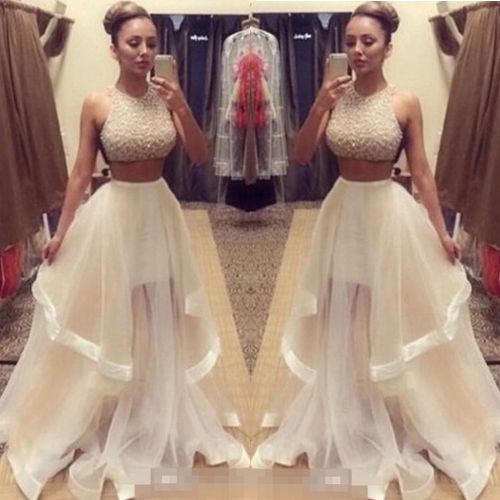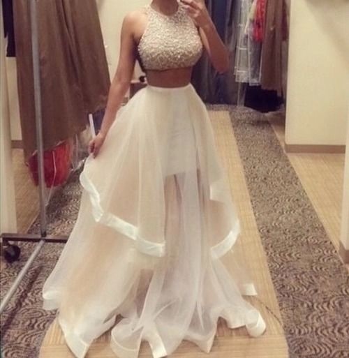 White 2 pieces beading sequins long pom dress ,white evening dress
