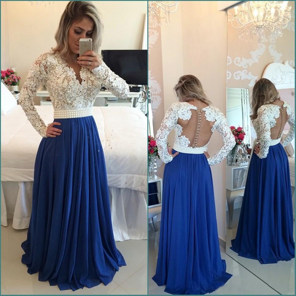 Navy blue and white lace long sleeve long pom dress , evening dress