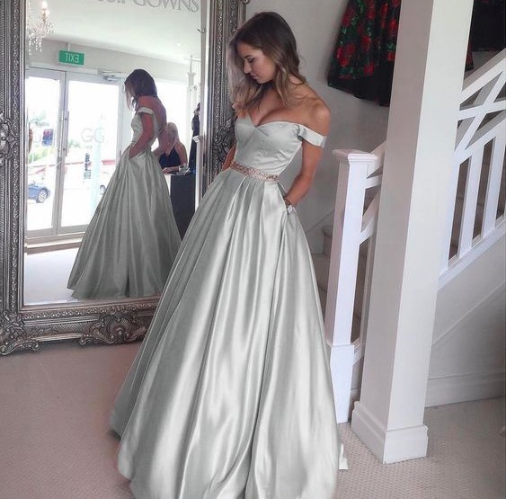 Gray off shoulder long prom dress,gray evening dresses