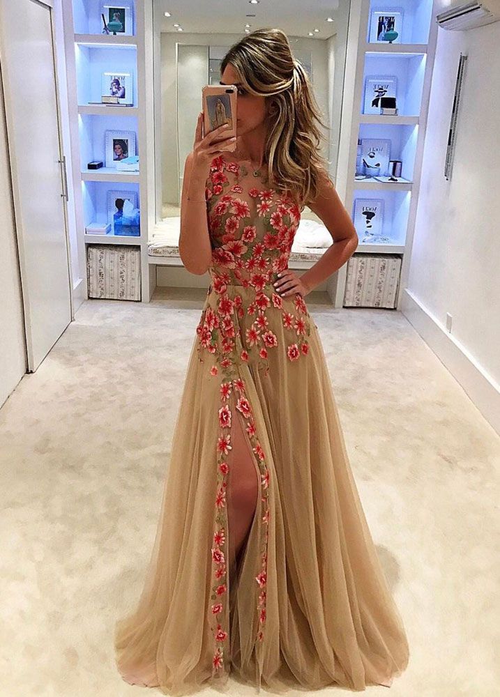 Unique champagne tulle lace long prom dress,champagne evening dresses