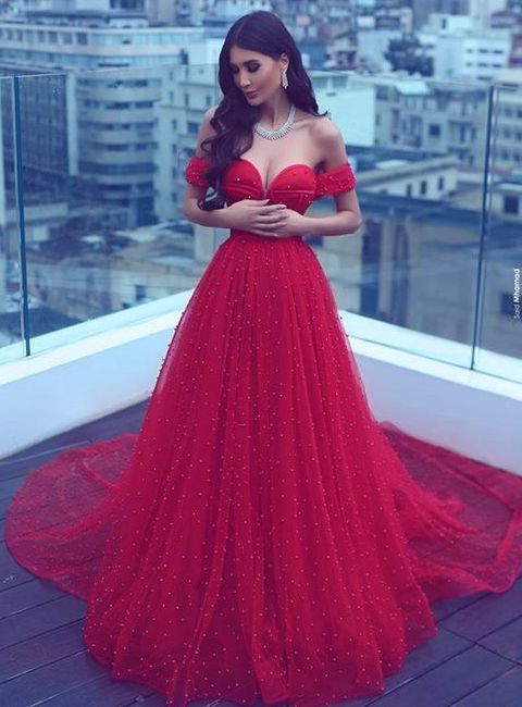 Amazing red tulle long prom dress with pearl,red evening dresses
