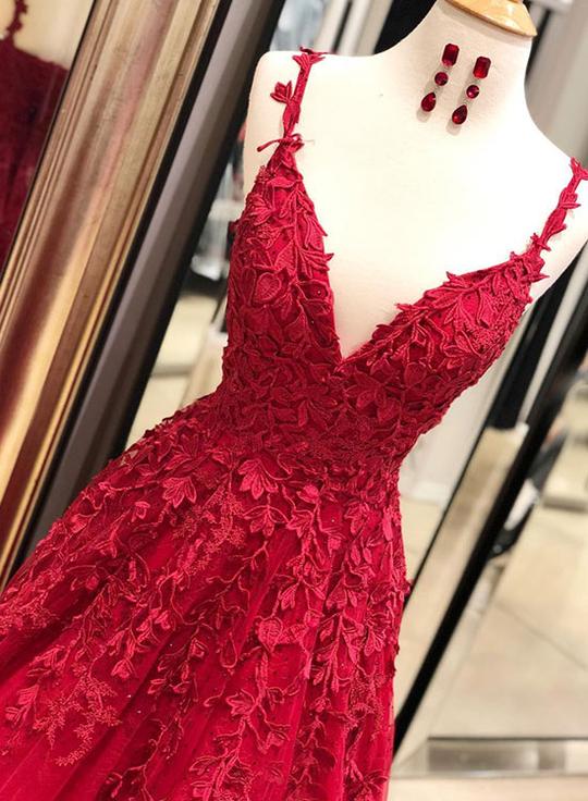 Burgundy v neck lace long prom dress, burgundy evening dress