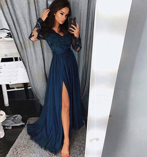 Dark green v neck lace long prom dress, long sleeve evening dress
