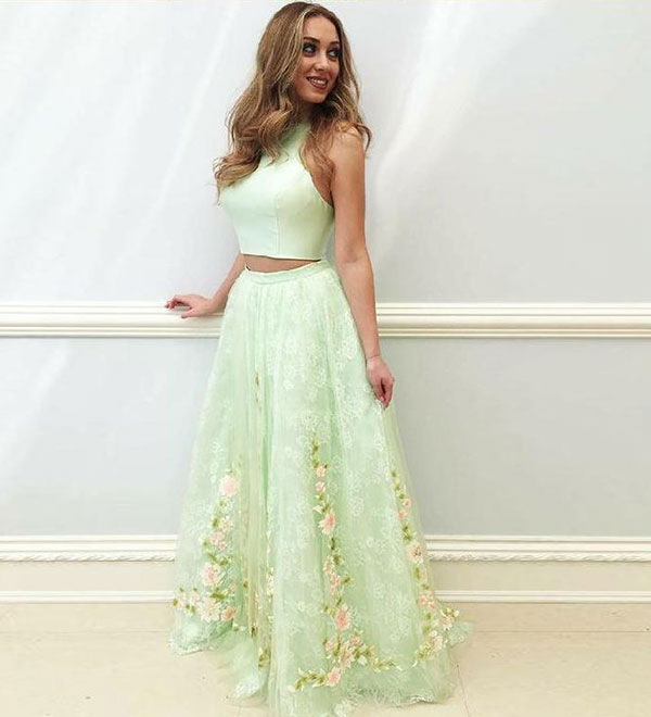 Mint green two pieces lace long prom dress, evening dress