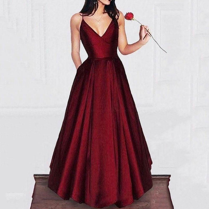 Burgundy v neck satin long prom dress evening dress