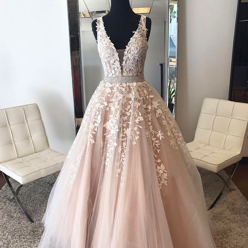 Elegant tulle lace long prom gown evening dress