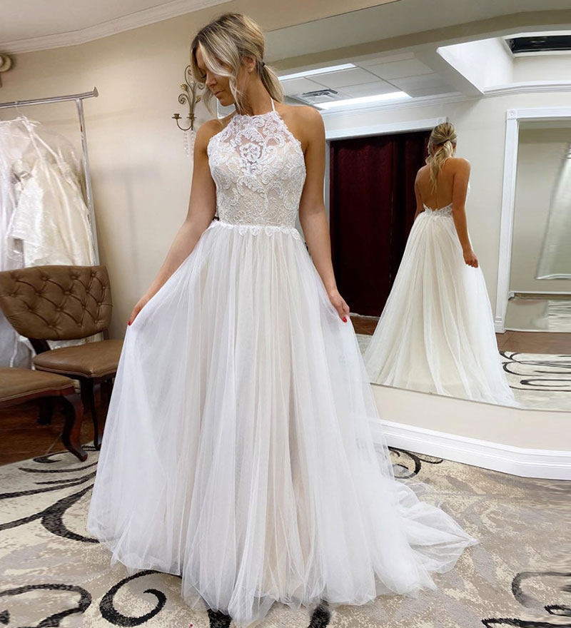 White tulle lace long prom dress white evening dress