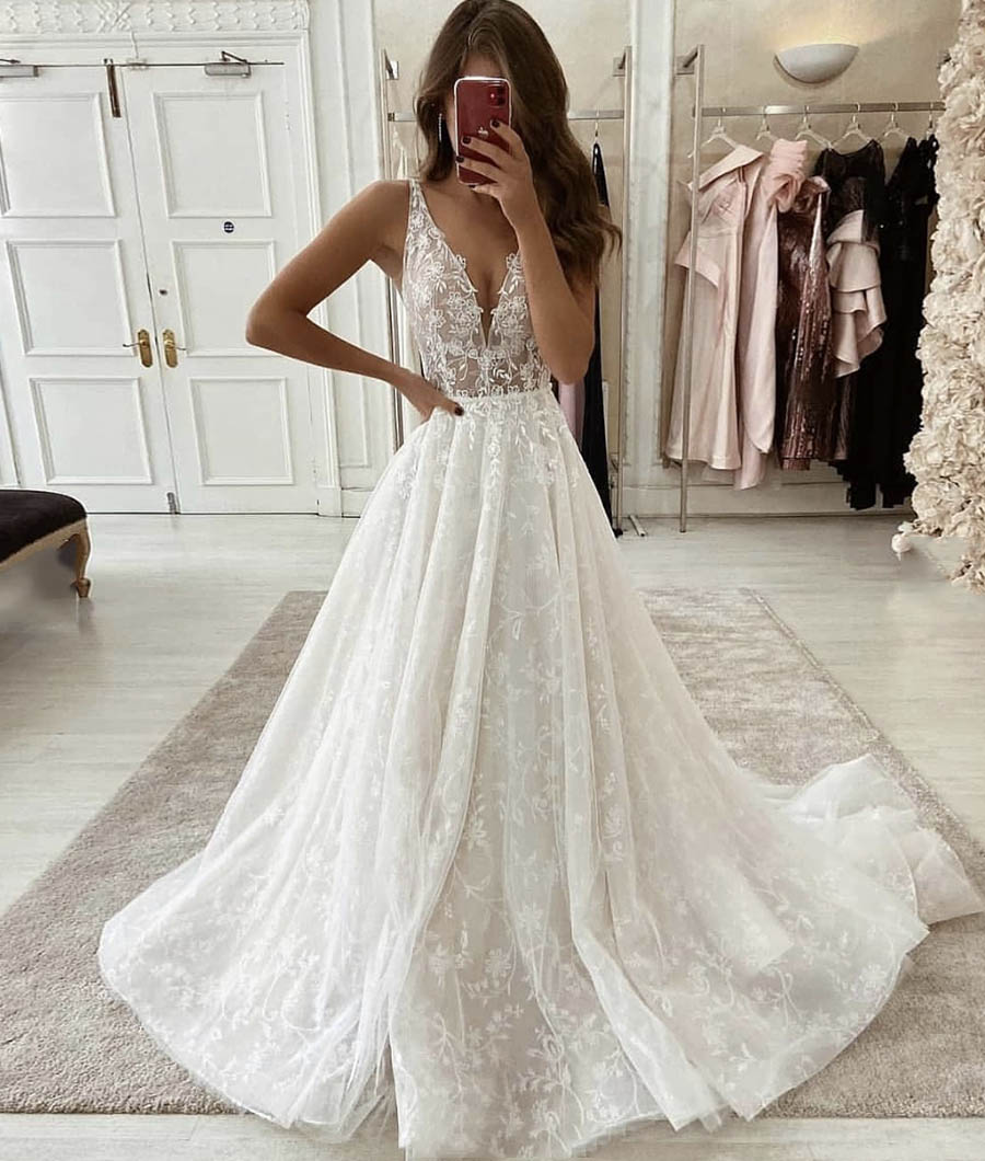 White lace long prom gown white evening dress