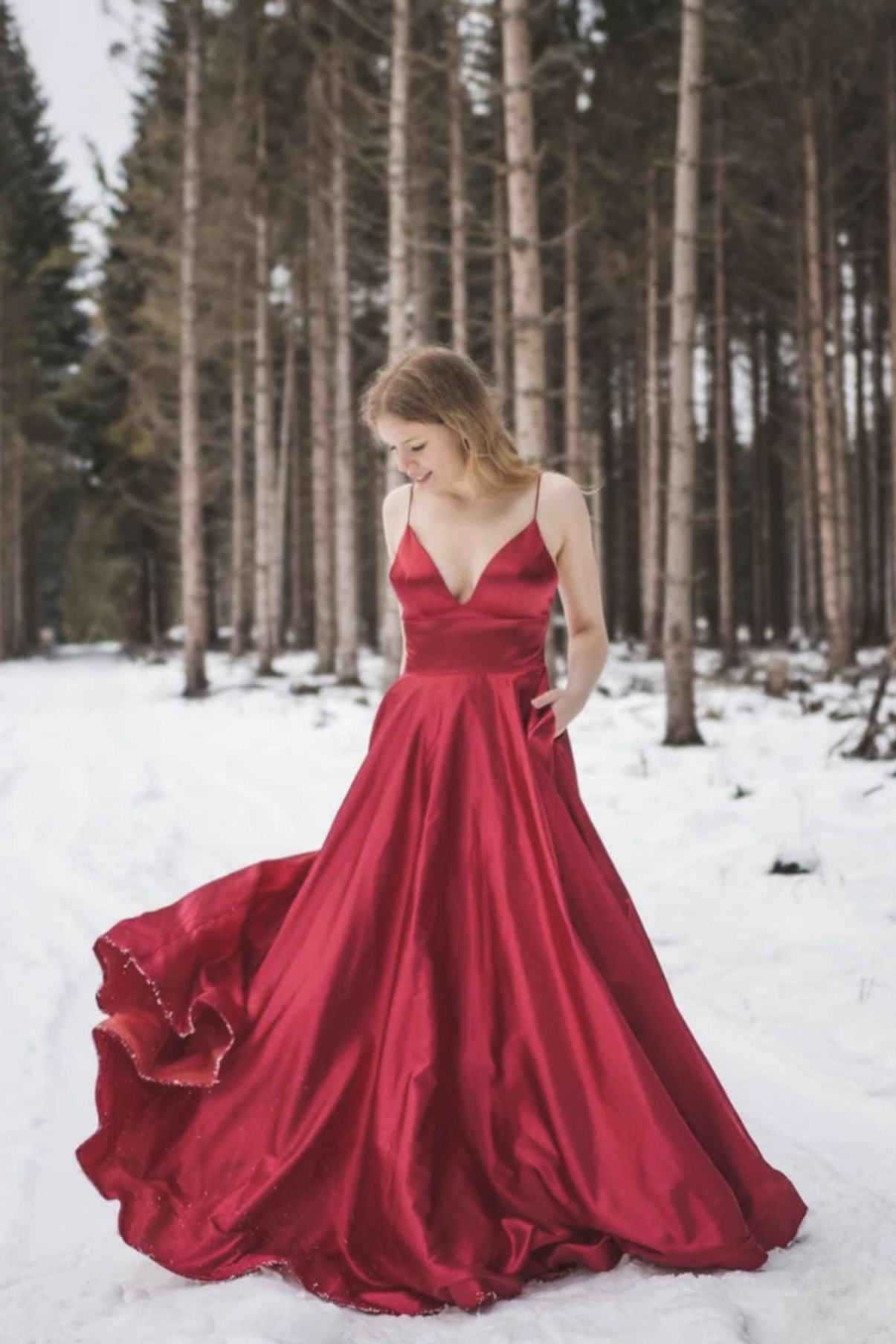 Red v neck satin long prom dress A line evening dress