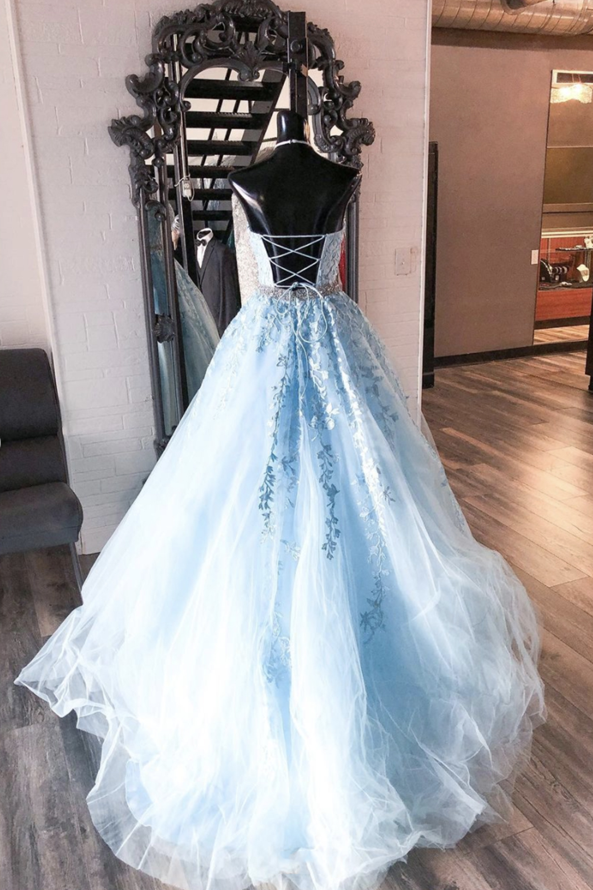 Blue lace long A line ball gown dress formal dress