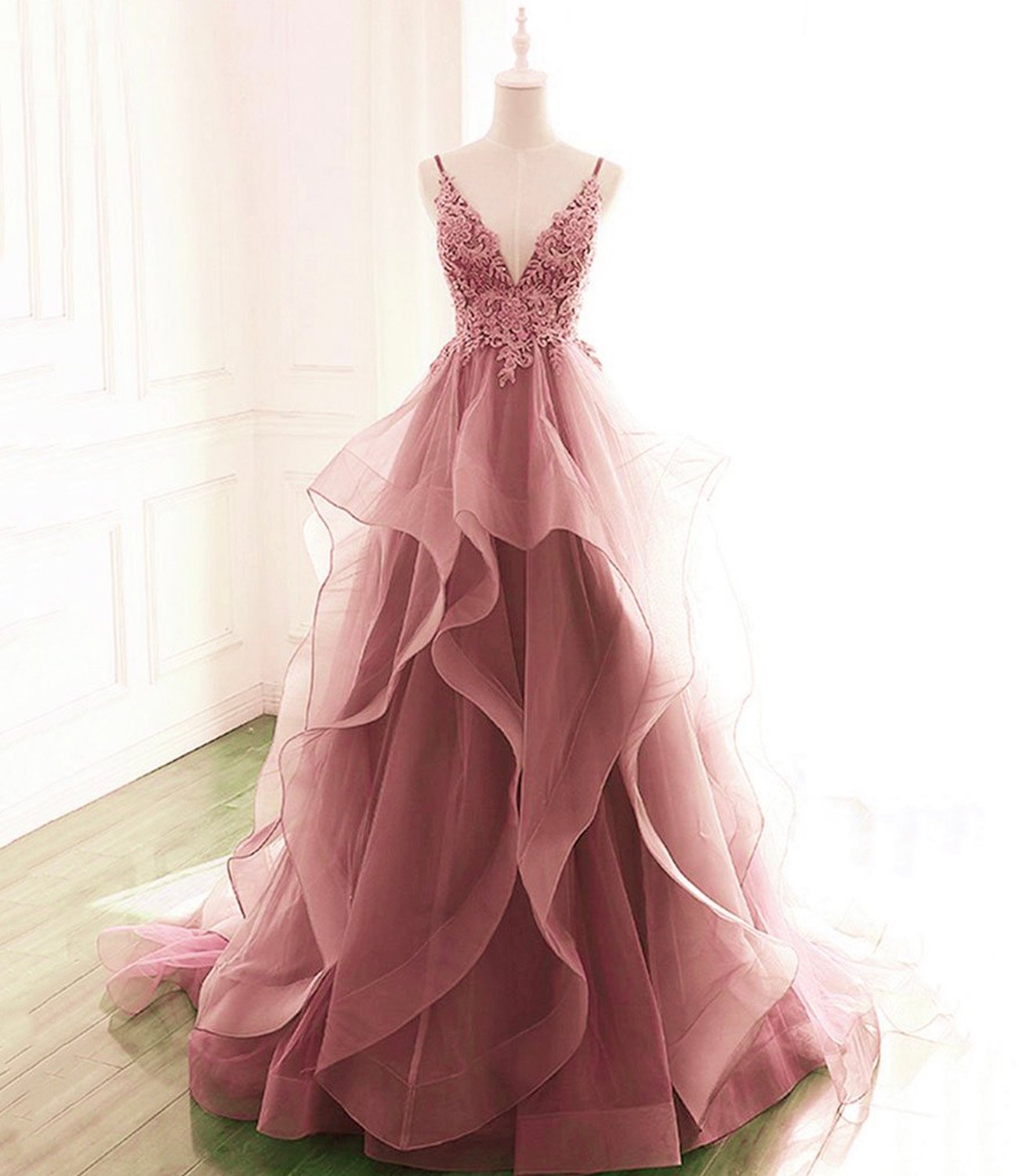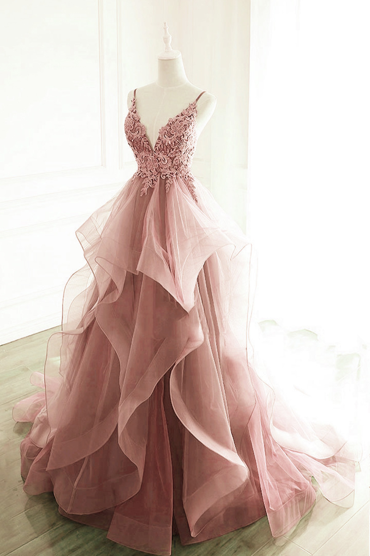 Pink lace long A line prom dress pink evening dress