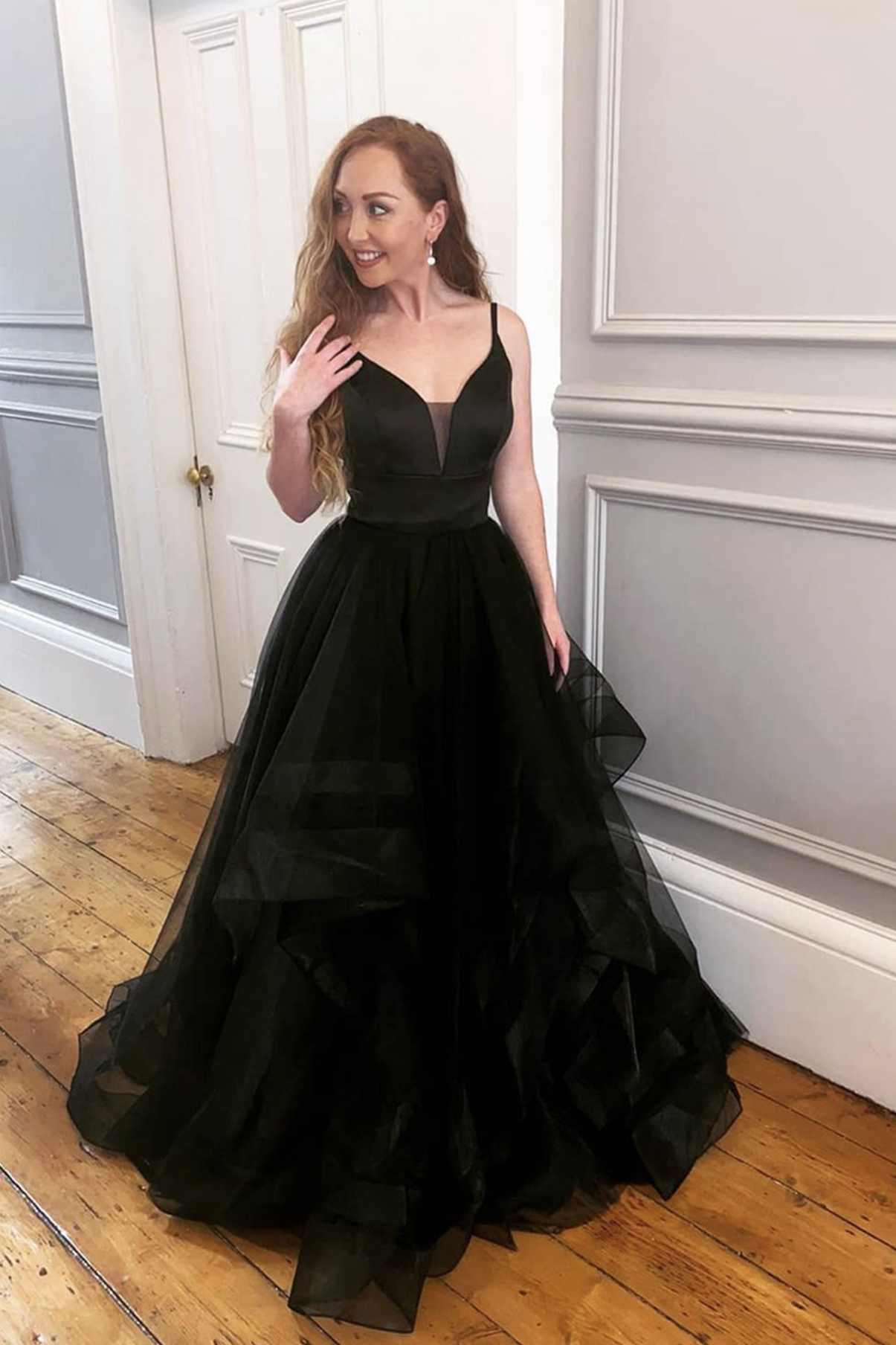 Black v neck tulle long A line prom dress evening dress