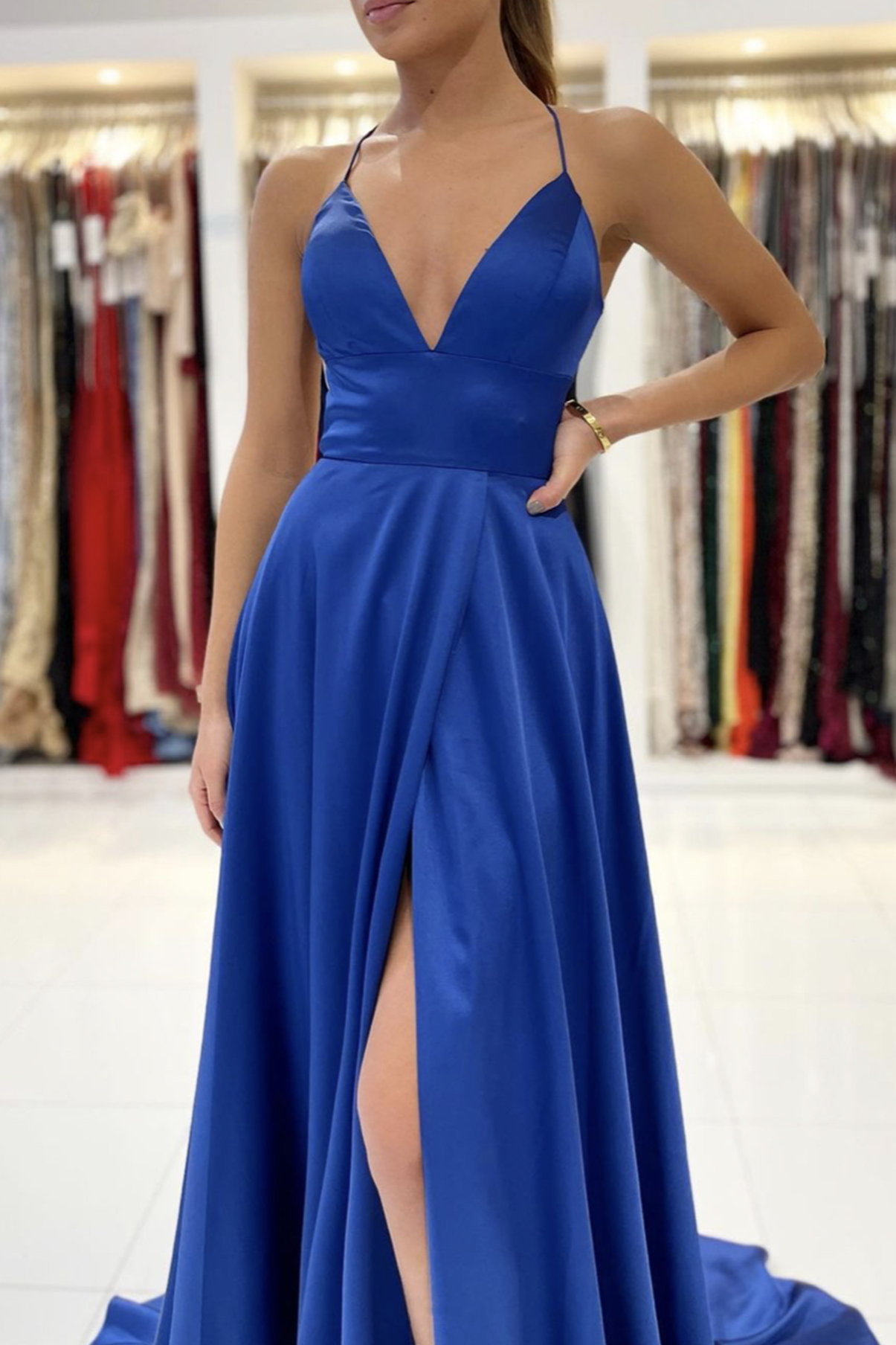 Blue satin long A line prom dress blue evening dress