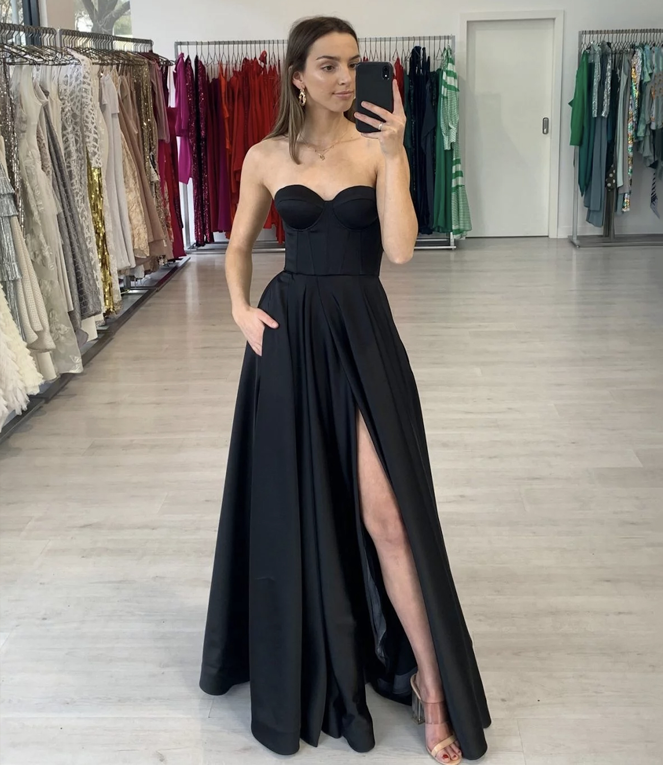 Black satin long A line prom dress black evening dress