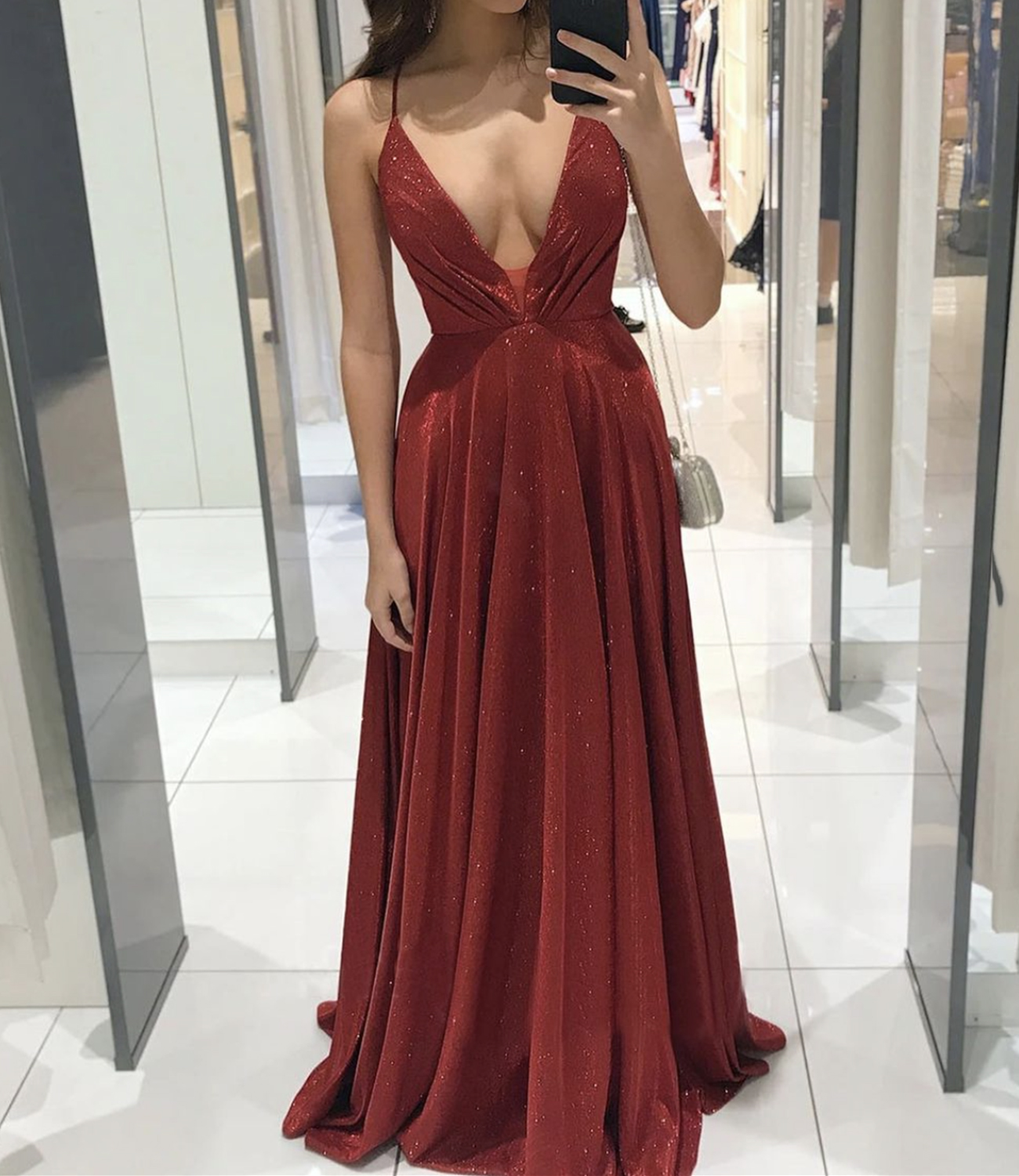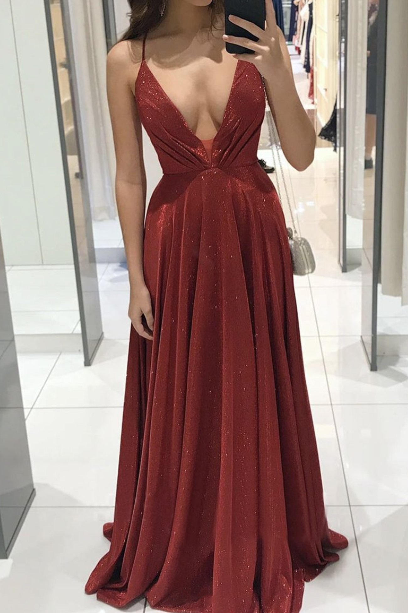 Shiny v neck long A line prom dress evening dress
