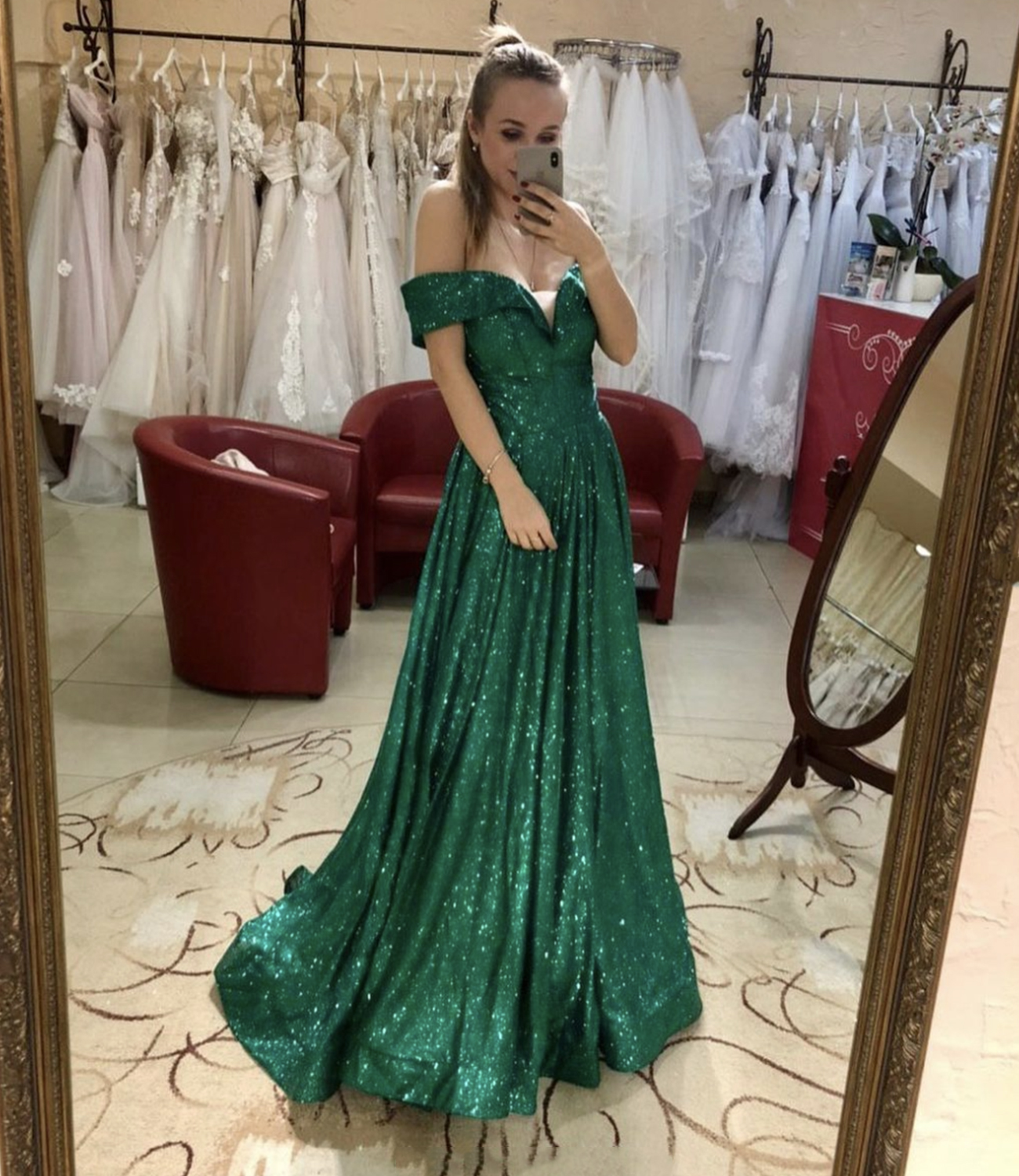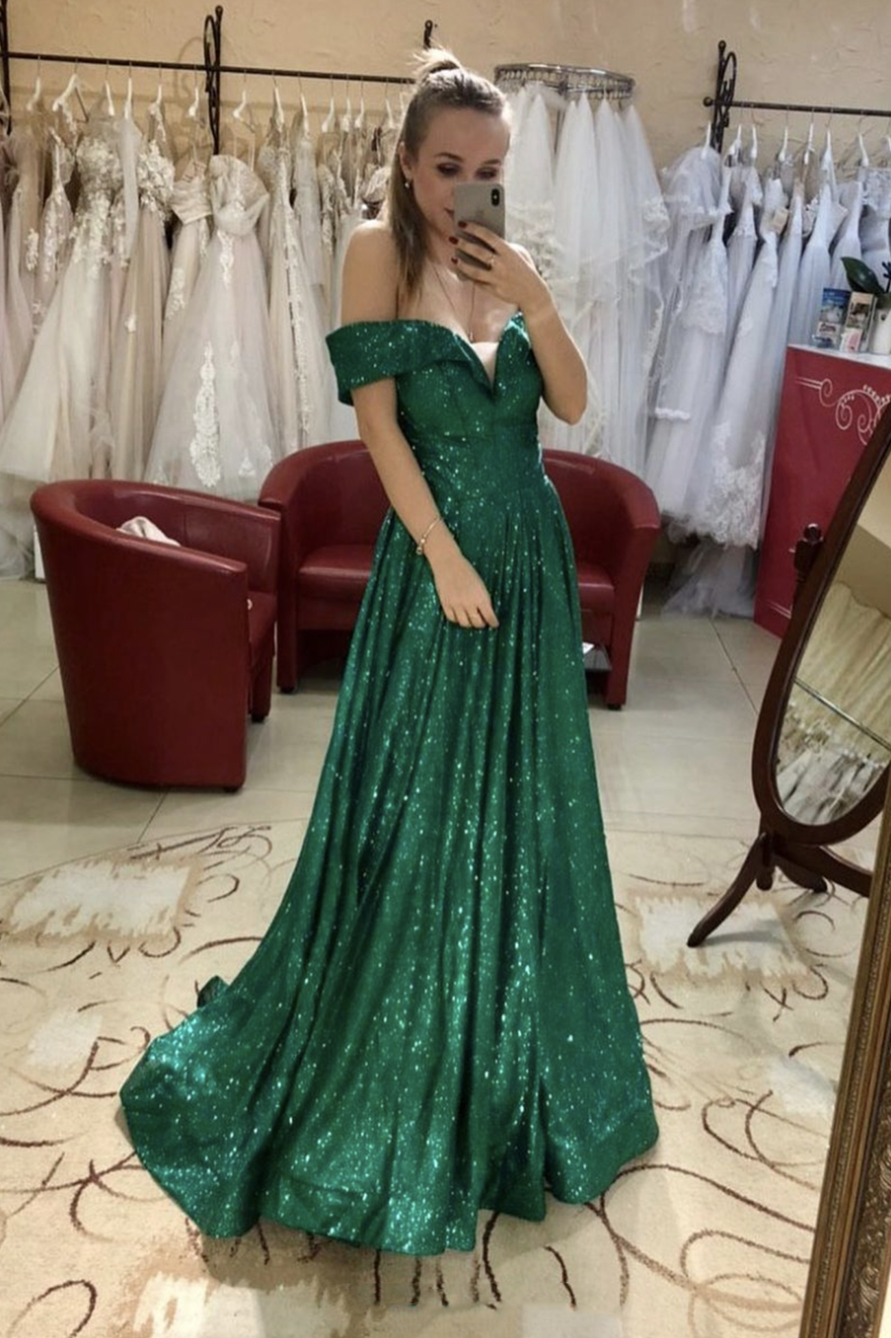 Green sequins long A line prom dress evening dress