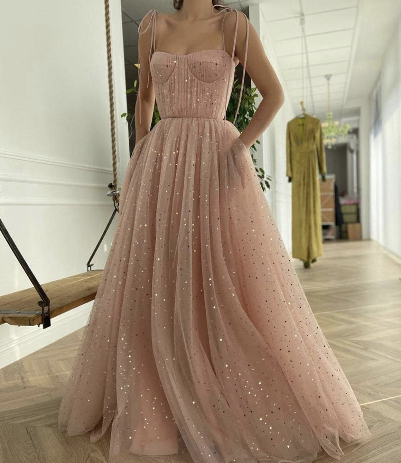 Pink tulle long A line prom dress pink evening dress