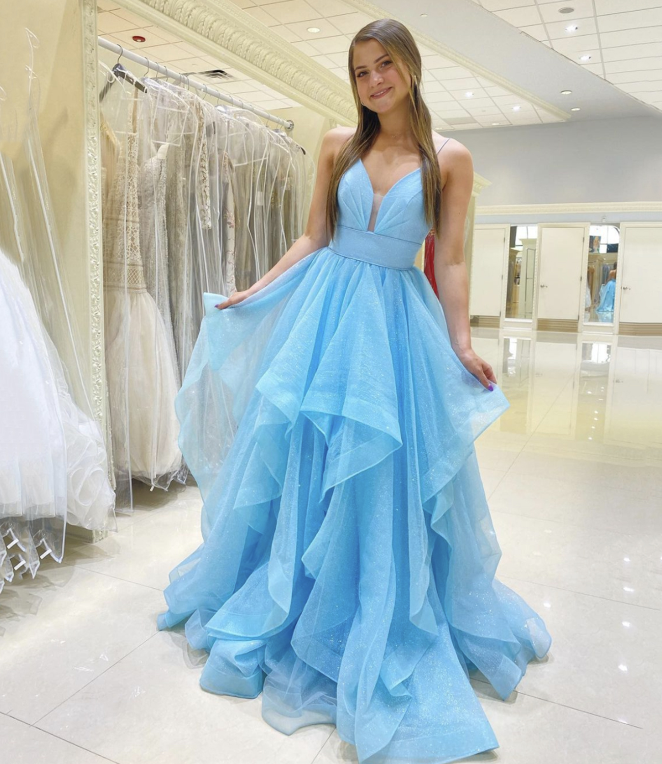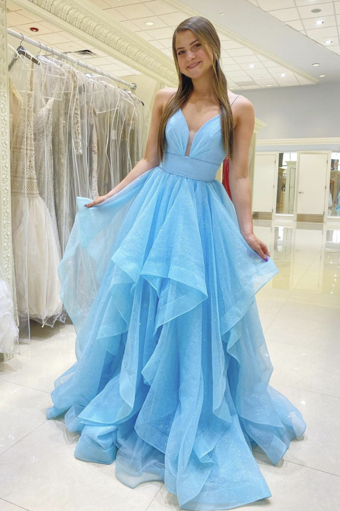Blue tulle long A line prom dress blue evening dress