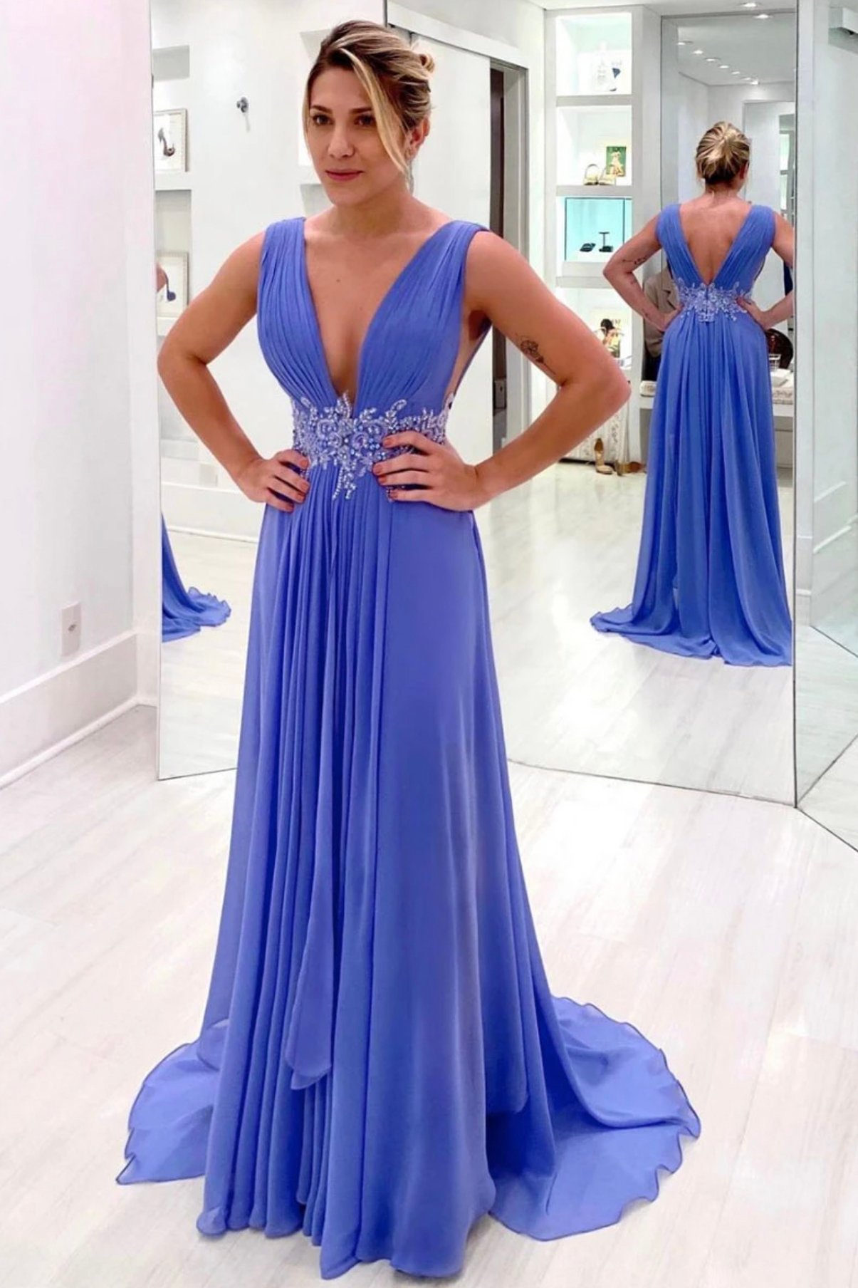 Blue chiffon long A line prom dress evening dress
