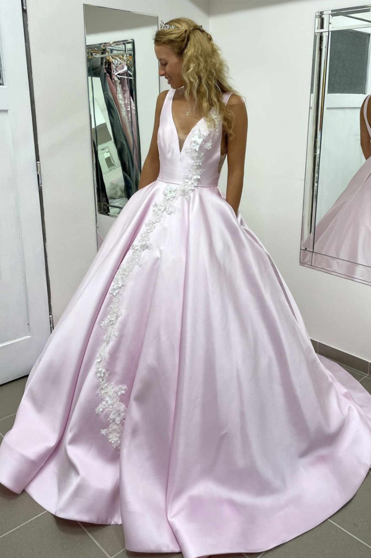 Pink v neck satin long A line prom dress evening dress