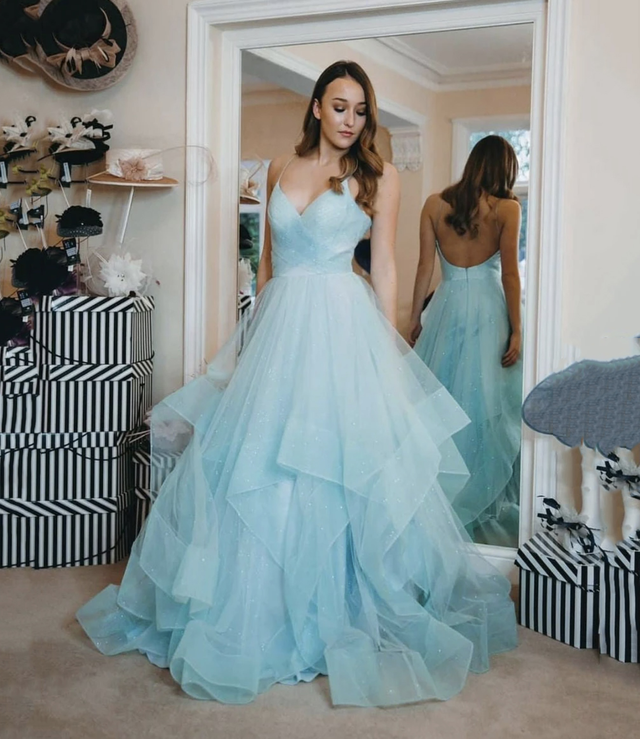 Blue tulle long A line prom dress blue evening dress