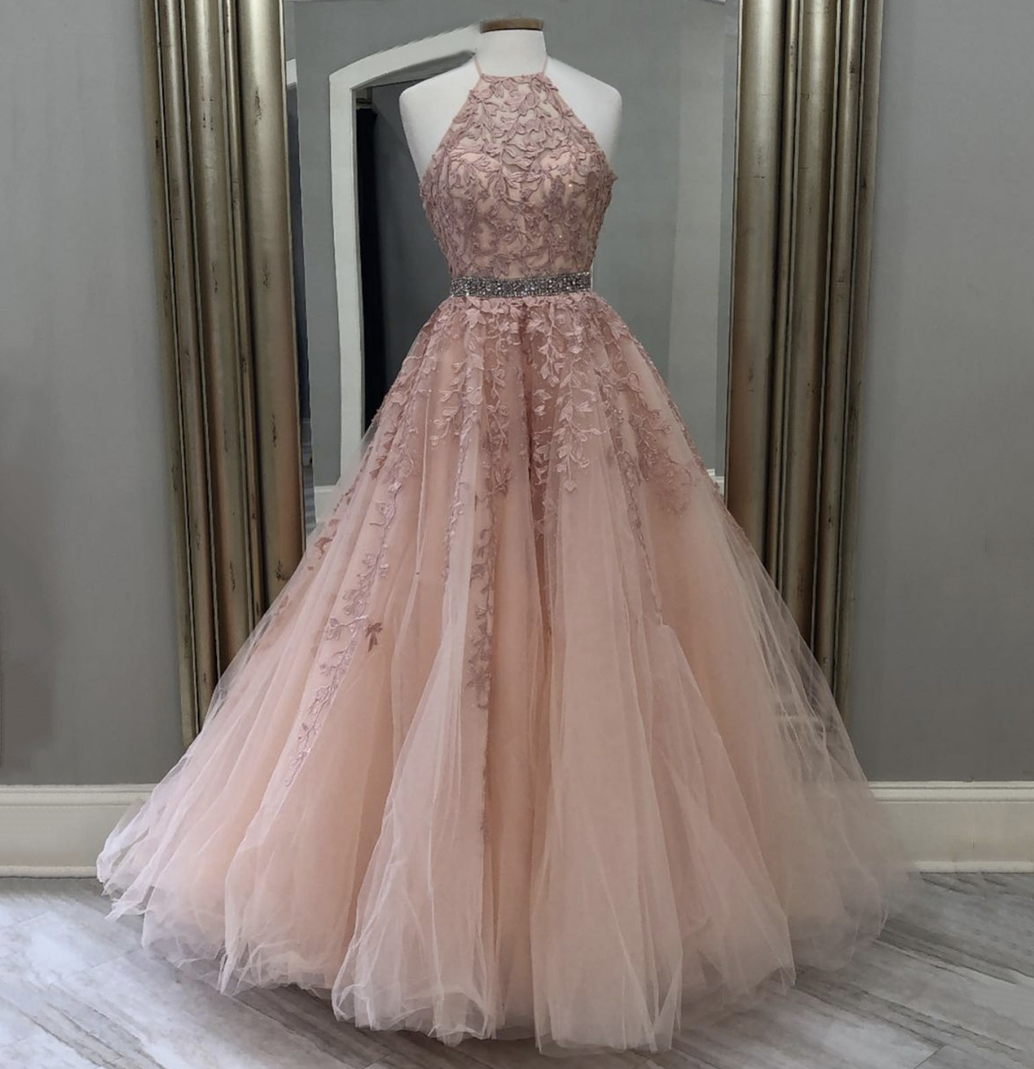 Pink tulle lace long prom dress A line evening gown