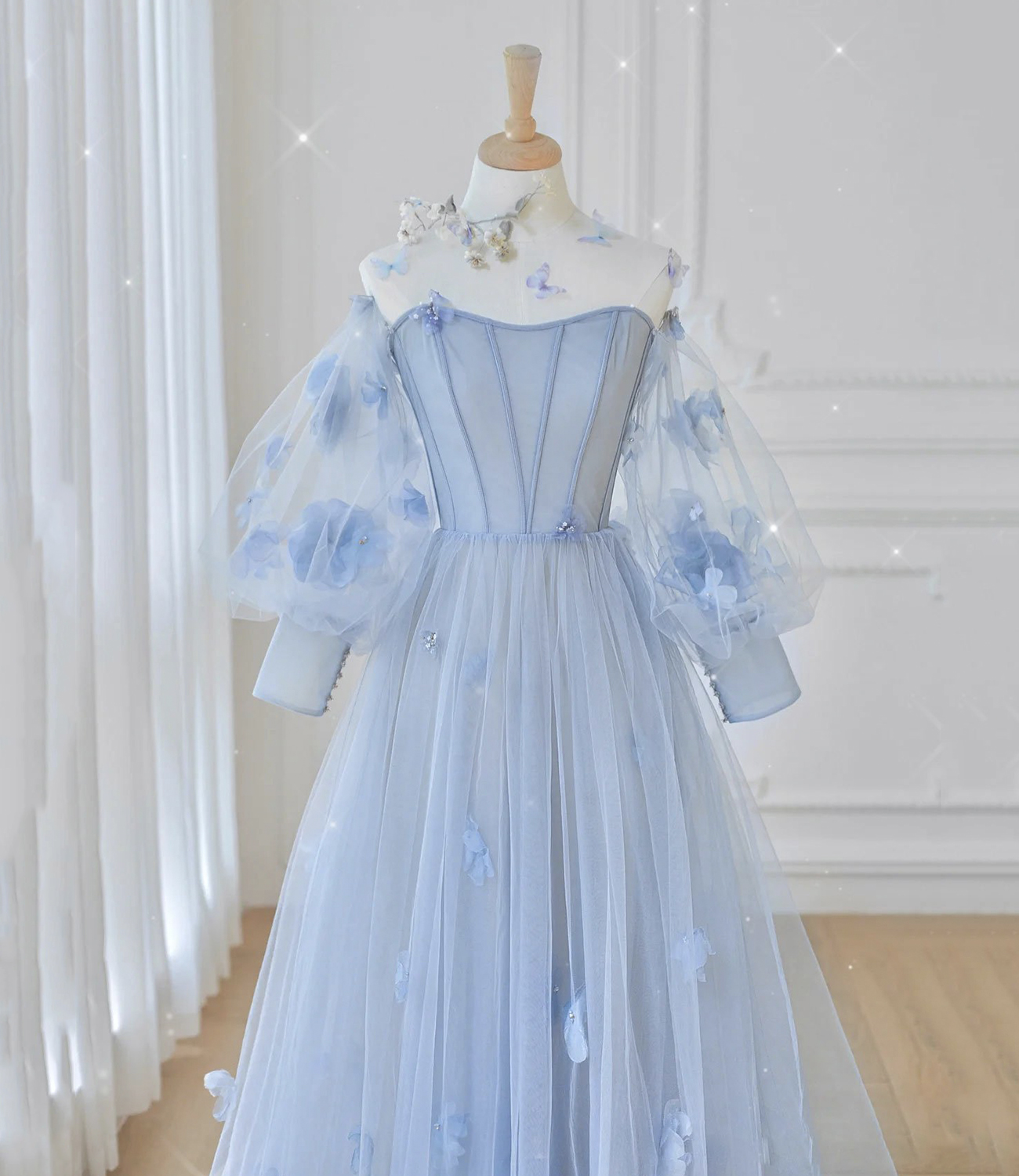 Blue tulle applique long prom dress blue evening gown