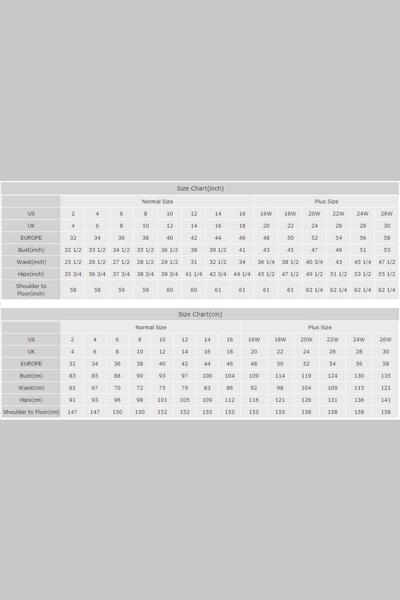 US 4 Bust(inch)33 1/2 Waist(inch)26 1/2 Hips(inch)36 3/4 Shoulder to Floor(inch)58