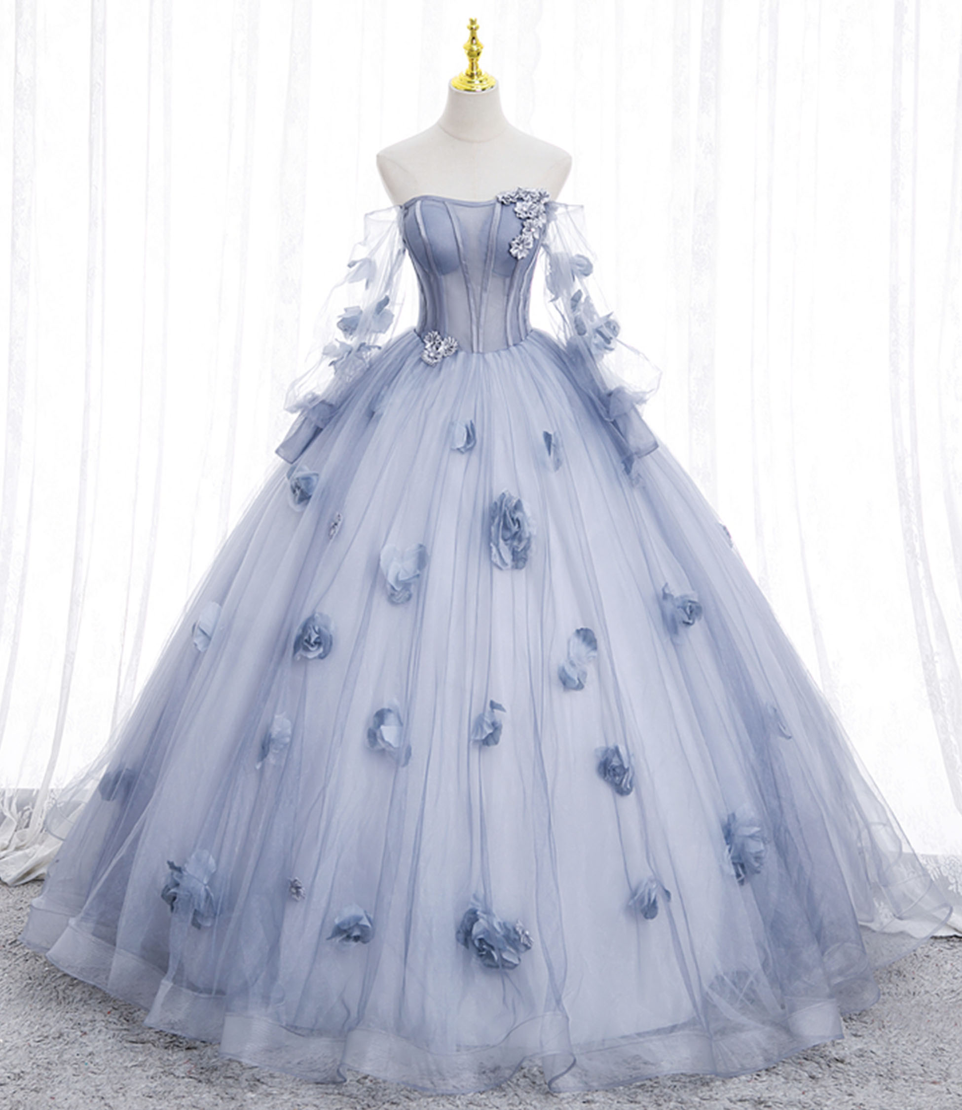 Blue tulle applique long ball gown A-line formal gown