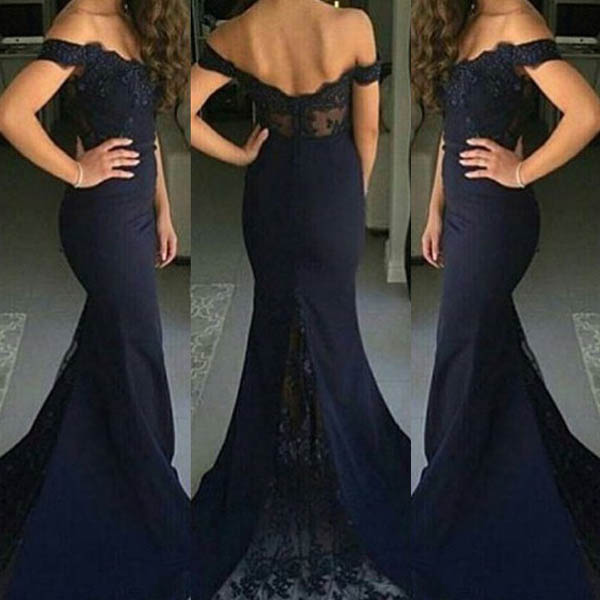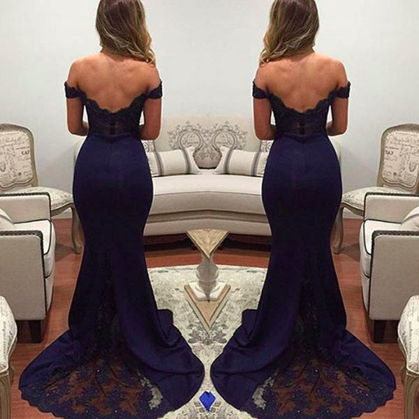 Navy blue mermaid lace off shoulder long prom dress with train,evening dresses