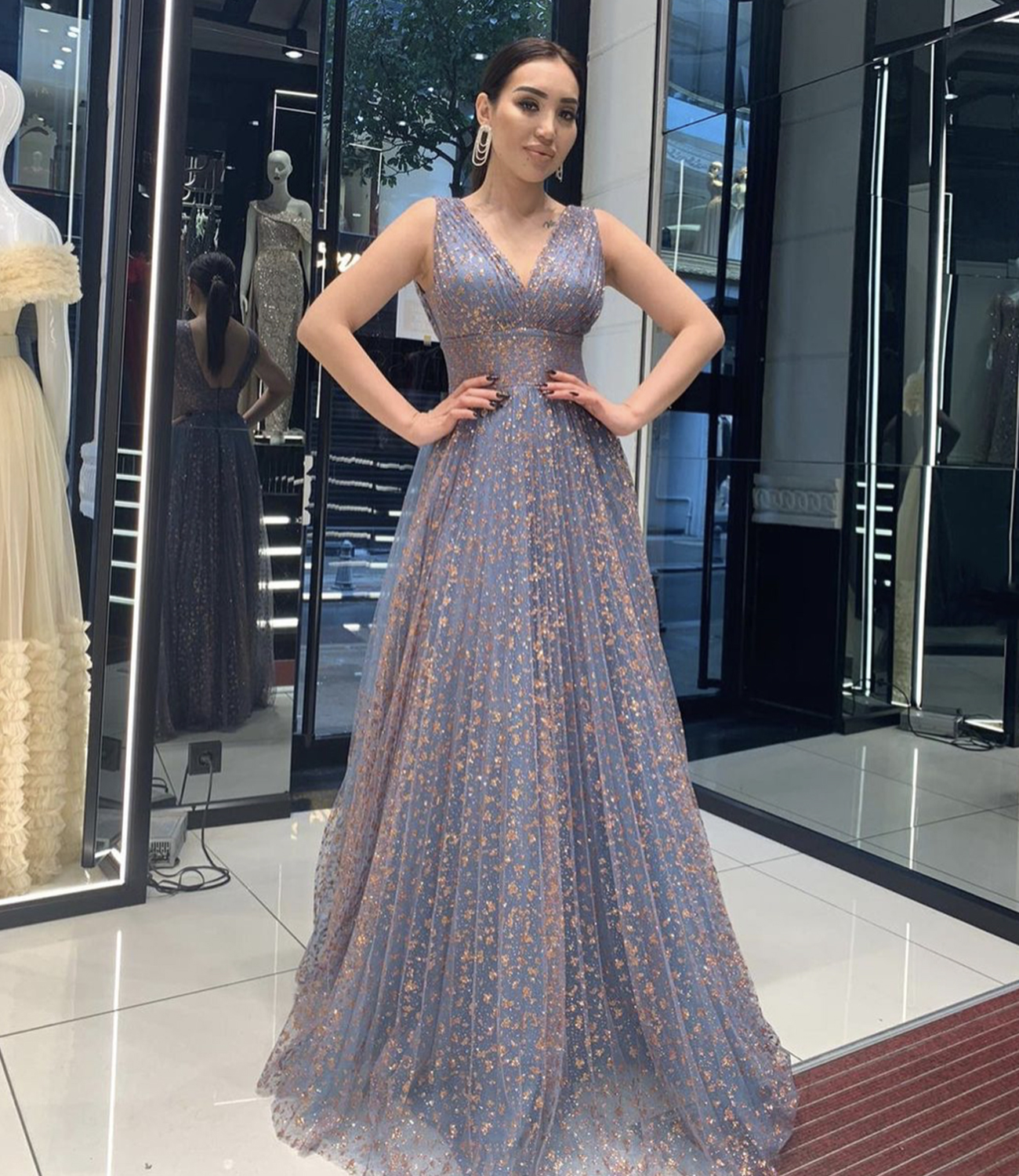 Blue v neck tulle sequins long prom dress evening dress