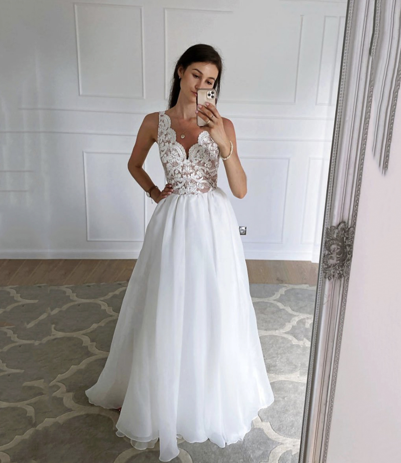White chiffon lace long prom dress A line evening dress