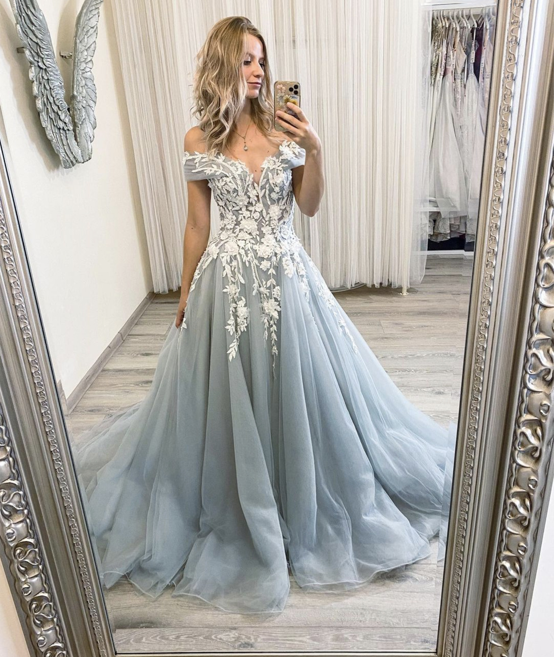 Grey Tulle Lace Long Prom Dresses, Off the Shoulder Evening Dresses